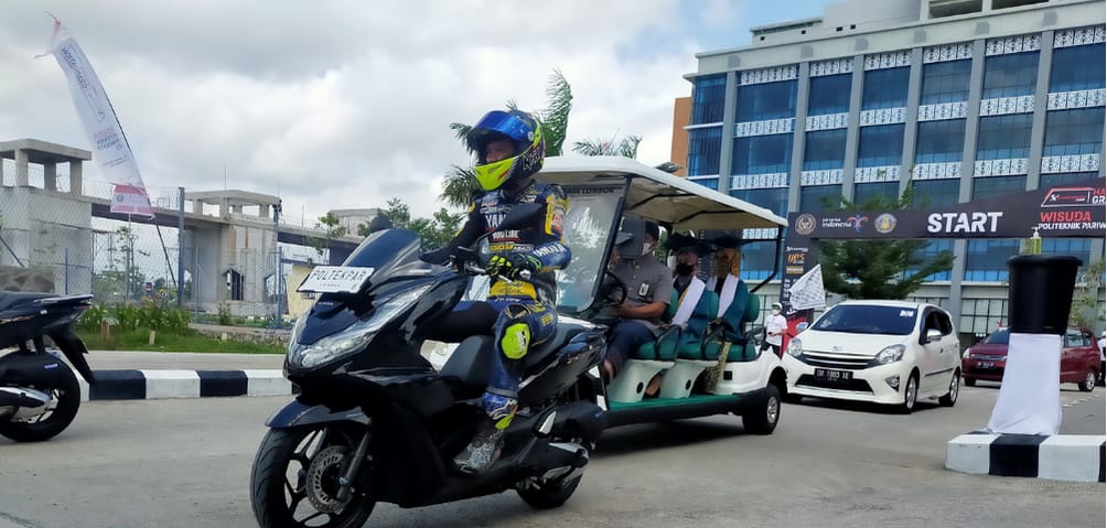 PRAYA, MataramPost.com- Penyelenggaraan wisuda bagi 341 mahasiswa Politeknik Pariwisata (Poltekpar) Lombok tahun 2021 yang diselenggarakan pada Jumat (22/10) siang, terbilang unik. Karena digelar dalam dua sesi. Wisuda mahasiswa yang berasal dari empat program studi yaitu pengaturan perjalanan, seni kuliner, tata hidang dan divisi kamar ini selain digelar secara daring, juga secara langsung dengan konsep Drive Thru, konsep yang bernuansa MotorGP.